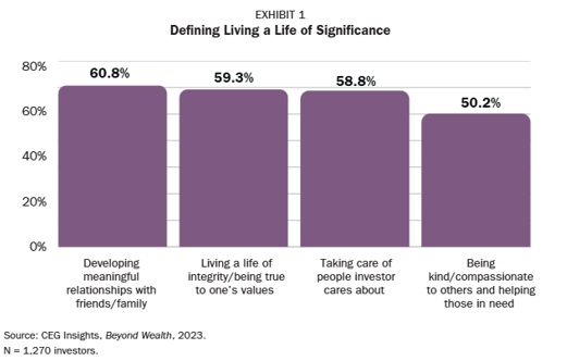 Indeed, CEG Insights research found that “taking care of people (the) investor cares about” was how nearly 60% of investors defined living a life of significance—while 50% defined it as “being kind/compassionate to others and helping those in need.” (See Exhibit 1.)