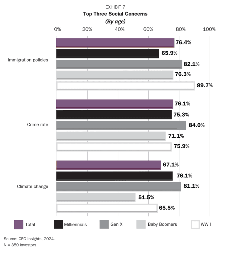 CEG Insights’ research found that WWII generation investors are more concerned than any other age group about immigration policies, with nearly 90% indicating it is a concern. They are less concerned than millennial and Gen X investors about the impacts of climate change, with 65.5% indicating it is a concern, compared with 81.1% of Gen Xers and 76.1% of millennials. Gen X investors are most concerned about crime rates (see Exhibit 7).
