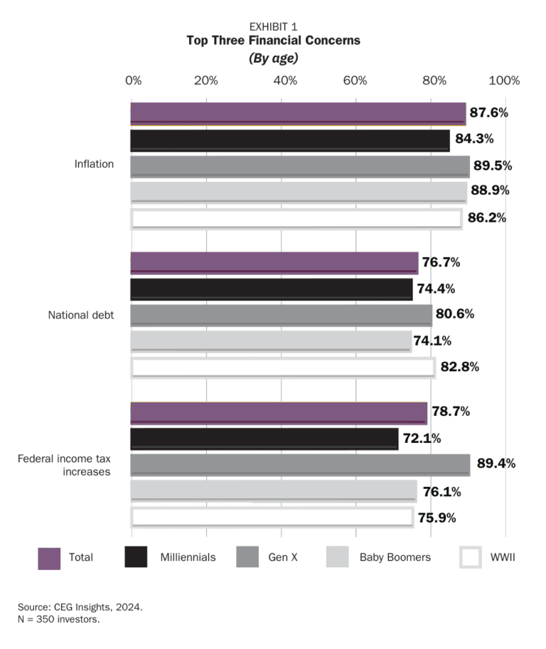 Ultra-wealthy investors are primarily concerned about inflation, the national debt, federal and state income tax increases, stock market performance, and potential market corrections. The political environment is the most significant social concern for wealthy investors. Older investors are more worried than their younger counterparts about political issues. Immigration policies, crime rates, the national debt and climate change are also major concerns for over two-thirds of the wealthy. Among investors, Gen Xers are the most apprehensive about these social issues.