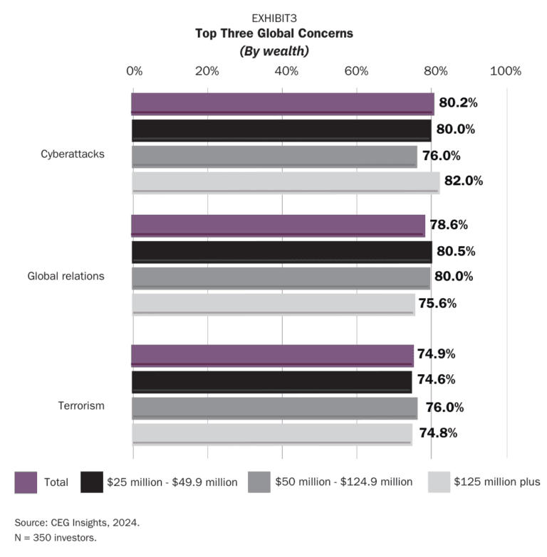 Cyberattacks, global relations and terrorism are major concerns for the ultra-wealthy, on the radar of approximately three-quarters of this demographic. Note that the most affluent investors are the most concerned about cyberattacks (see Exhibit 3).