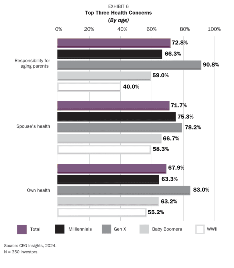 Health issues—particularly their own and their spouse’s health—are important to more than two-thirds of the wealthiest clients. Another significant concern is the responsibility of caring for aging parents. Gen X investors are apprehensive about these issues, particularly the care of elderly parents. Additionally, millennial and WWII generation investors are concerned about spending their final years in a care facility (see Exhibit 6).