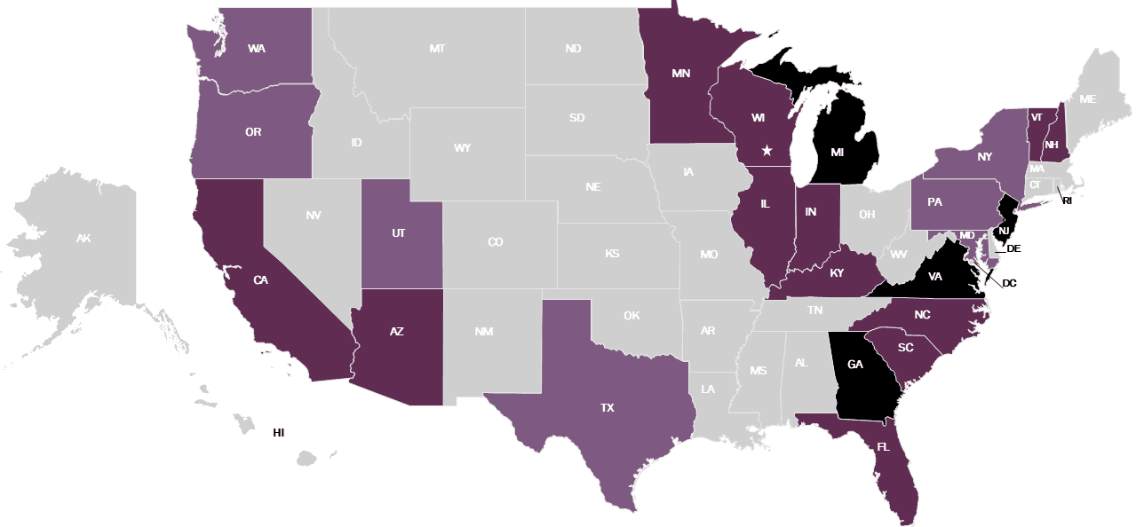 WI, AZ, CA, FL, GA, IL, IN, KY, MI, MN, MO, NH, NJ, VT, VA, NC, SC